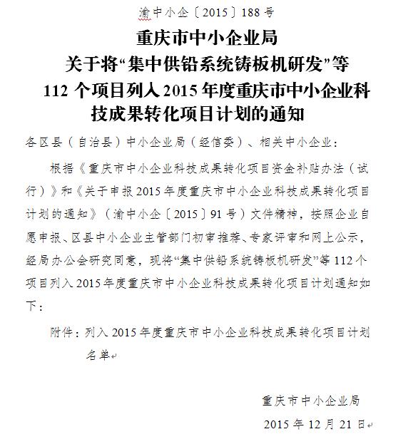 多年以來(lái),重慶城建經(jīng)濟(jì)(集團(tuán))重慶綠色科技開發(fā)有限公司與重慶房地產(chǎn)職業(yè)學(xué)院進(jìn)行產(chǎn)學(xué)研合作,堅(jiān)持創(chuàng)新發(fā)展,研發(fā)了“中國(guó)創(chuàng)造”“互聯(lián)網(wǎng)+多色溫防霧霾亮度可調(diào)智能控制系統(tǒng)及LED智能燈具”技術(shù)。該技術(shù)自2015年7月22日申報(bào)2015年度重慶市中小企業(yè)科技成果轉(zhuǎn)化項(xiàng)目計(jì)劃后,現(xiàn)已于2015年12月21日成功列入科技成果轉(zhuǎn)化項(xiàng)目計(jì)劃。通知文件如下:
