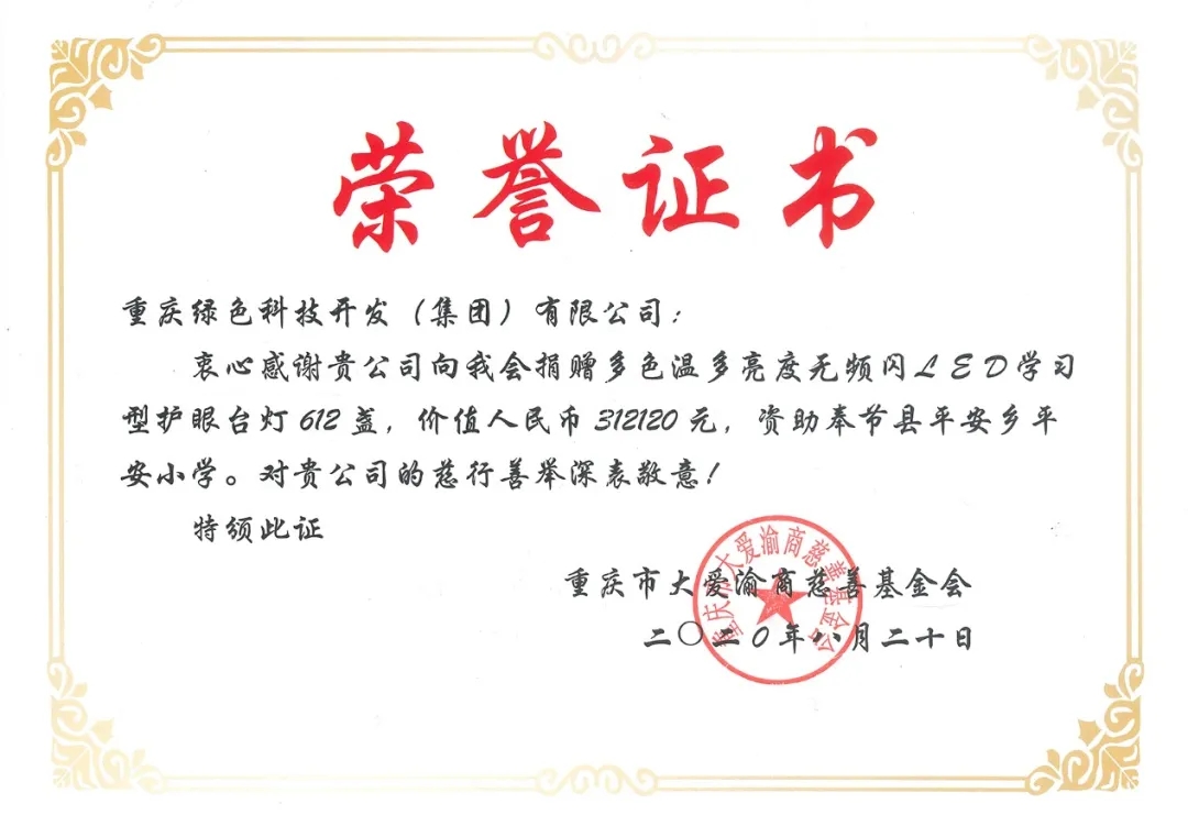 2020年8月5日,重慶綠色科技開(kāi)發(fā)(集團(tuán))有限公司支持國(guó)家級(jí)重點(diǎn)貧困縣精準(zhǔn)扶貧工作,通過(guò)重慶市大愛(ài)渝商慈善基金會(huì),向奉節(jié)縣平安鄉(xiāng)平安小學(xué)捐贈(zèng)多色溫多亮度無(wú)頻閃LED學(xué)習(xí)型護(hù)眼臺(tái)燈612盞、太陽(yáng)能智慧燈桿4套,總價(jià)值36.2萬(wàn)元的愛(ài)心物資,助力脫貧攻堅(jiān)。